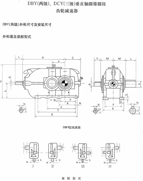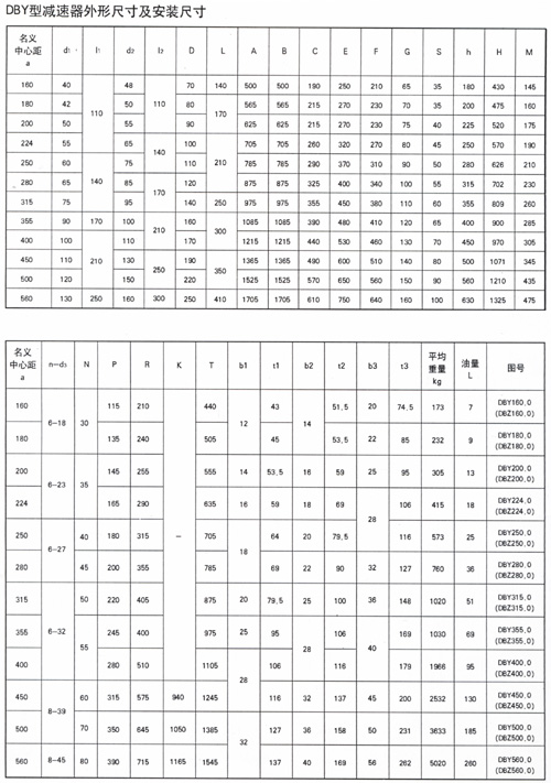 DBY、DBYK、DBZ型减速器各有12种规格, 名义中心距为 :160,180,200,224,250,280,315,355,400,450,500,560mm;每种规格均有5种传动比(8,10,11.2,12.5
