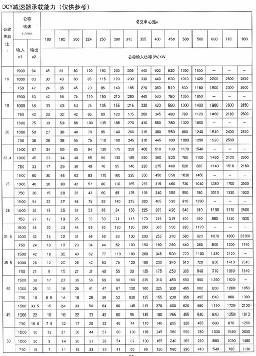DCY、DCYK、DCZ型减速器各有15种规格 ,名义中心距为:160,180,200,224,250,280,315,355,400, 450,500,560,630,710,800mm;每种规格均有11种传动比(16,18,20,22.4,25,28,31.5,35.5,40,45,50;),两种旋向,四种装配型式,分别组成660种减速器。
